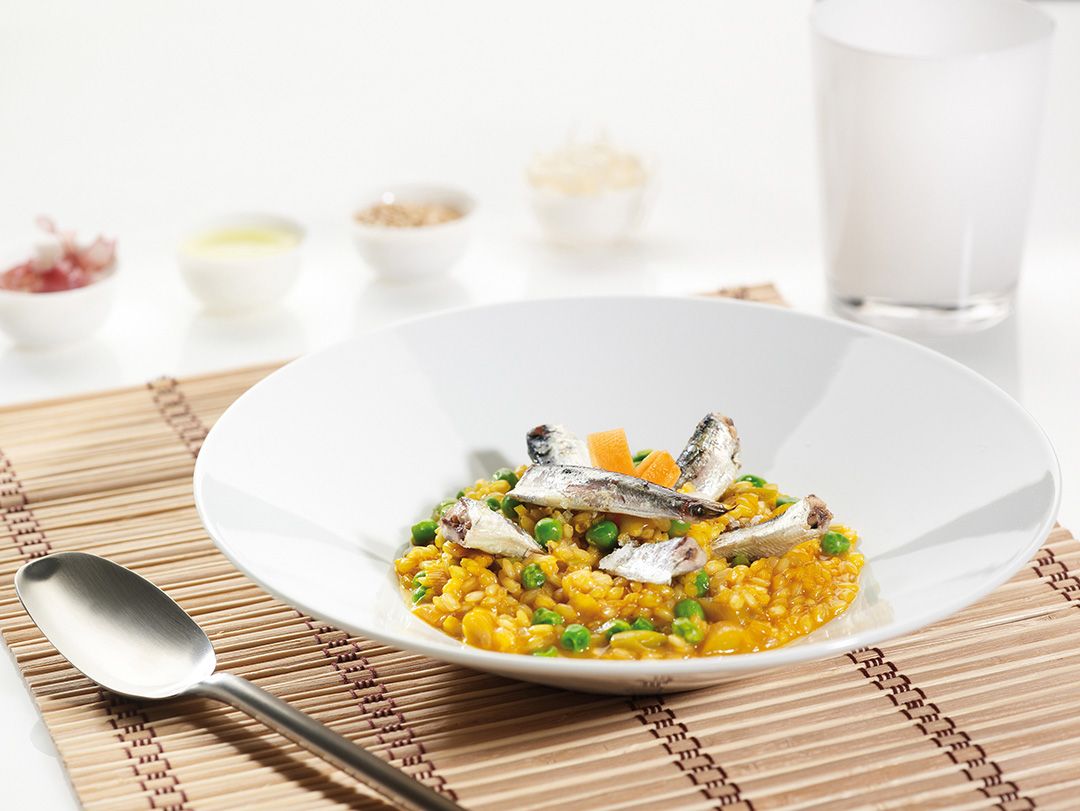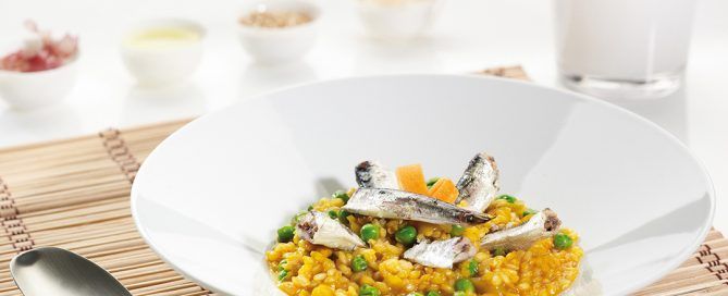Ingredientes: 1 lata de Sardinillas en Aceite de Oliva Arroz de grano corto Zumo de zanahoria licuado Caldo de pollo o verdura Guisantes congelados 4 ajos tiernos (ajetes) Aceite de Más información